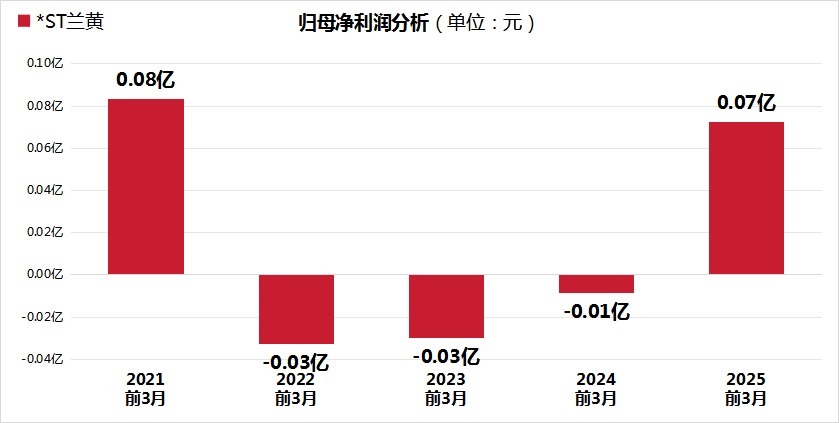 从最新一期财务表现来看,2025年一季度,*ST兰黄实现营业收入0.48亿元,同比下降11.49%;实现归母净利润0.07亿元,同比增长高达934.62%,净利率(利润与营收比值)仅为4.88%。